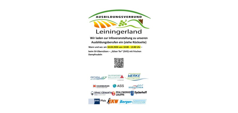 Die Ausbildungsmesse beginnt um 10 Uhr, bis 13 Uhr stehen die Unternehmensvertreter zur Beratung und zum Gespräch bereit. Der Sportverein lädt begleitend zur Messe zum Dampfnudelessen ein.