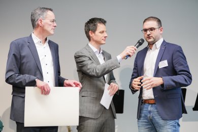 Ortsbürgermeister Daniel Krauß (rechts) spricht über die Dorferneuerung in Kleinkarlbach, kurz bevor Minister Michael Ebling die Urkunde überreicht. In den nächsten Schritten werden Projekte im Ort konkretisiert, kündigte er in Mainz an.