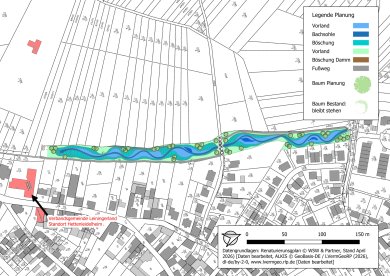 In dieser Darstellung ist zu erkennen, wie sich der Schulwiesengraben verändern wird. Das bislang gerade an den Grundstücksgrenzen verlaufende Gewässer so künftig mäandrieren und Raum für den Rückstau von Wasser bei Überschwemmungen und Starkregenereignissen schaffen.