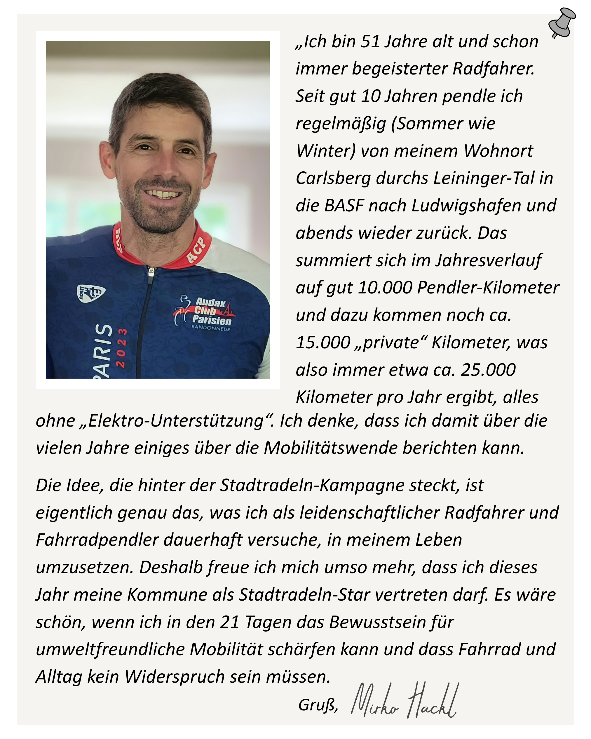 Das Amt des „STADTRADELN-Stars Leiningerland“ trägt in diesem Jahr Mirko Hackl aus Carlsberg.