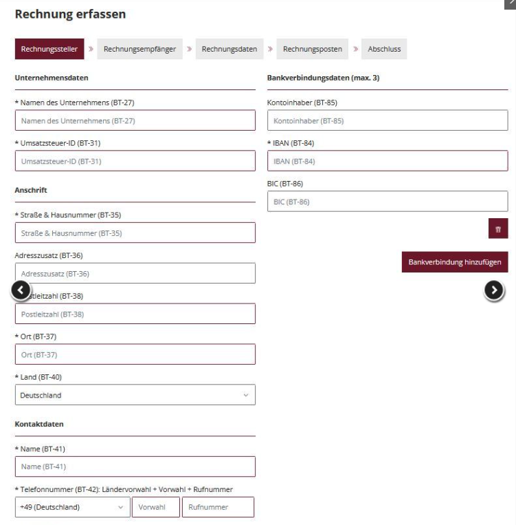 - Geben Sie alle Informationen zum Rechnungssteller, also Ihrem Unternehmen ein. Alle Felder mit * sind Pflichtfelder.