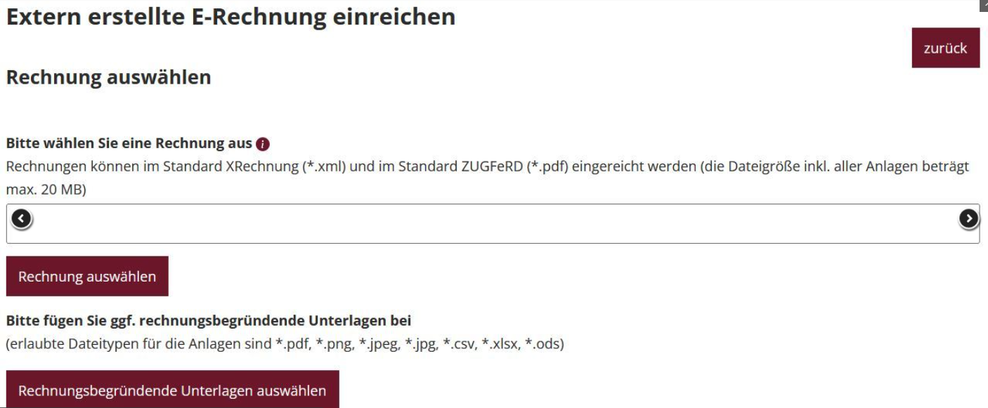 - Alle zusammengehörenden Rechnungs- und rechnungsbegleitenden Dokumente müssen in 1 Datei enthalten sein.