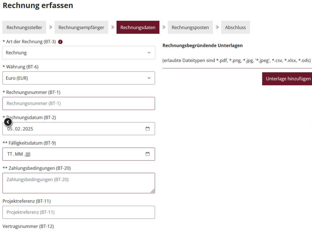 - Jetzt folgen die Details der Rechnung. Also Datum, Fristen, Zahlungsbedingungen etc. Hier können auch ergänzende Dokumente wie Pläne oder ähnliches hochgeladen werden.