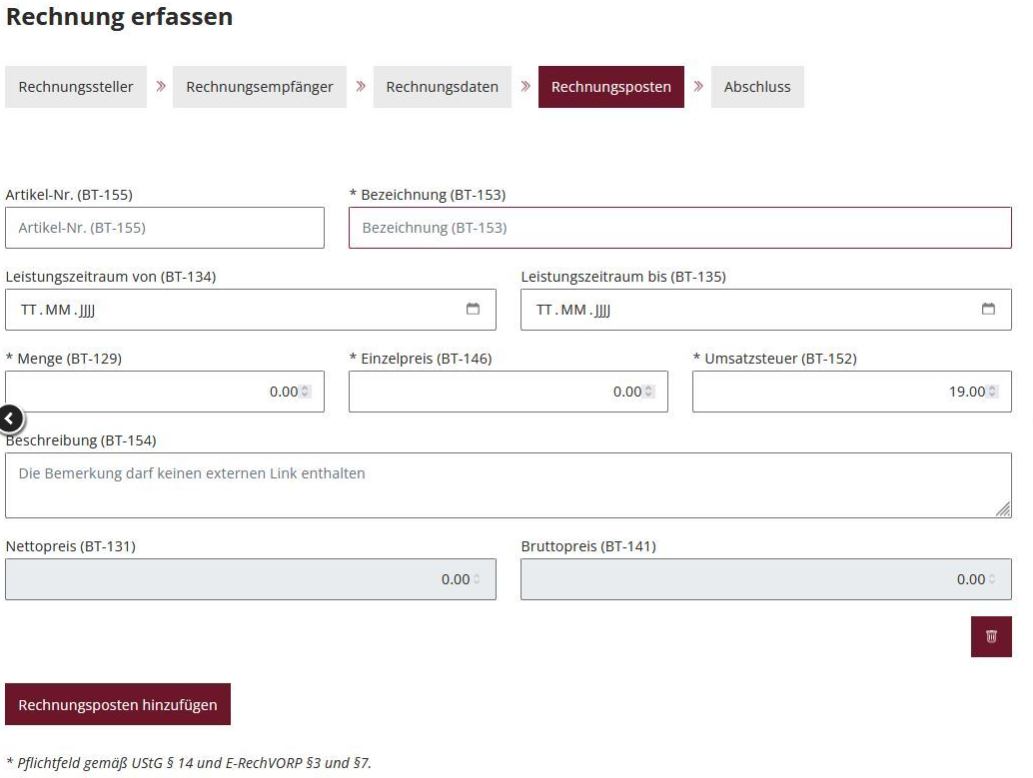 - Mehrere Posten können mit Klick auf den Button "Rechnungsposten hinzufügen" erstellt werden.