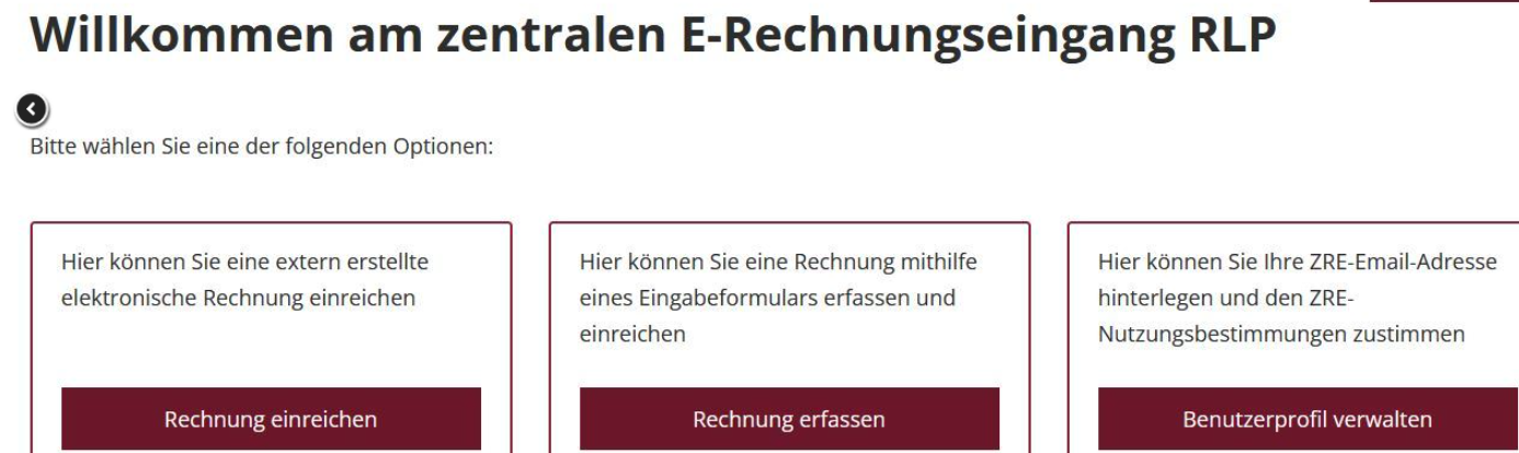 © e-rechnung.service.rlp.de- Im Anschluss stehen Ihnen die Optionen "Rechnung einreichen" und "Rechnung erfassen" zur Verfügung.