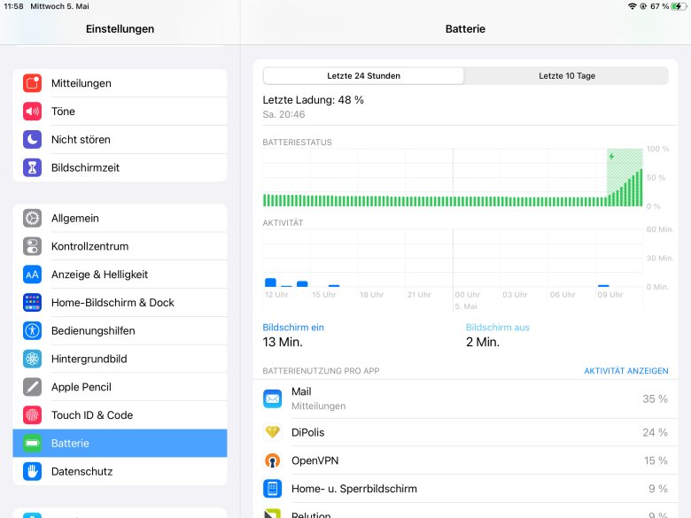 Je häufiger, bzw. intensiver Sie eine App verwenden, desto höher ist natürlich auch deren Stromverbrauch. Auch der zeitliche Ablauf der letzten 24 Stunden, bzw. 10 Tagen, wird dabei visualisiert.
