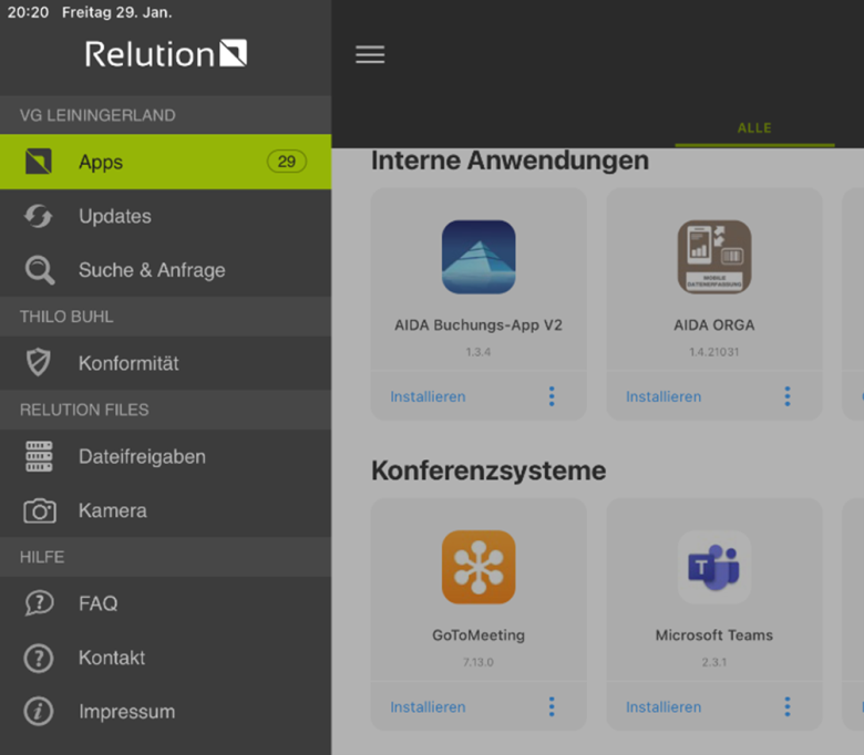 In der App "Relution" stehen ihnen eine Vielzahl von gängigen Anwendungen, die über das zentrale Management eingestellt wurden, zur Verfügung. Weitere Anwendungen können über den Menüpunkt Suchen&Anfragen gestellt werden. Diese werden dann im App-Store für die Anwender bezogen und stehen anschließend in der Relution-Anwendungsübersicht zur Installation zur Verfügung.