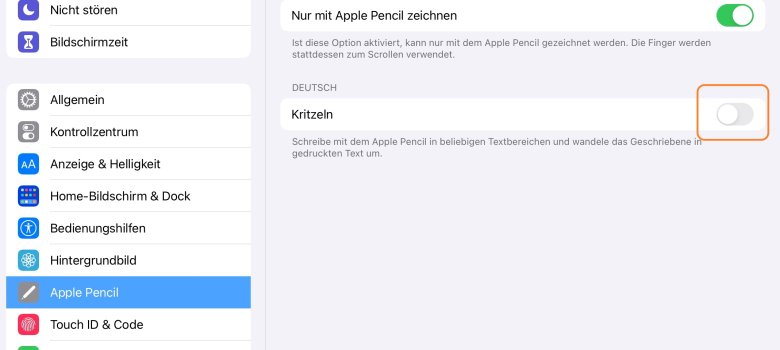 Die Einstellungen finden Sie über das Zahnrad (Einstellungen), dort auf Apple Pencil und den Schiebeschalter bei der Funktion "Kritzeln" deaktiveren.