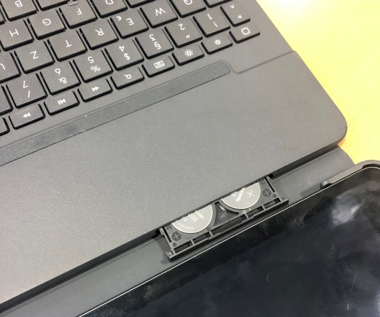 Hinzu kommt, auch die Tastatur beinhaltet eine Batterie. Diese finden Sie in einem schmalen Schacht auf der oberen Seite hinter dem Bereich der Tasten 2 - 5